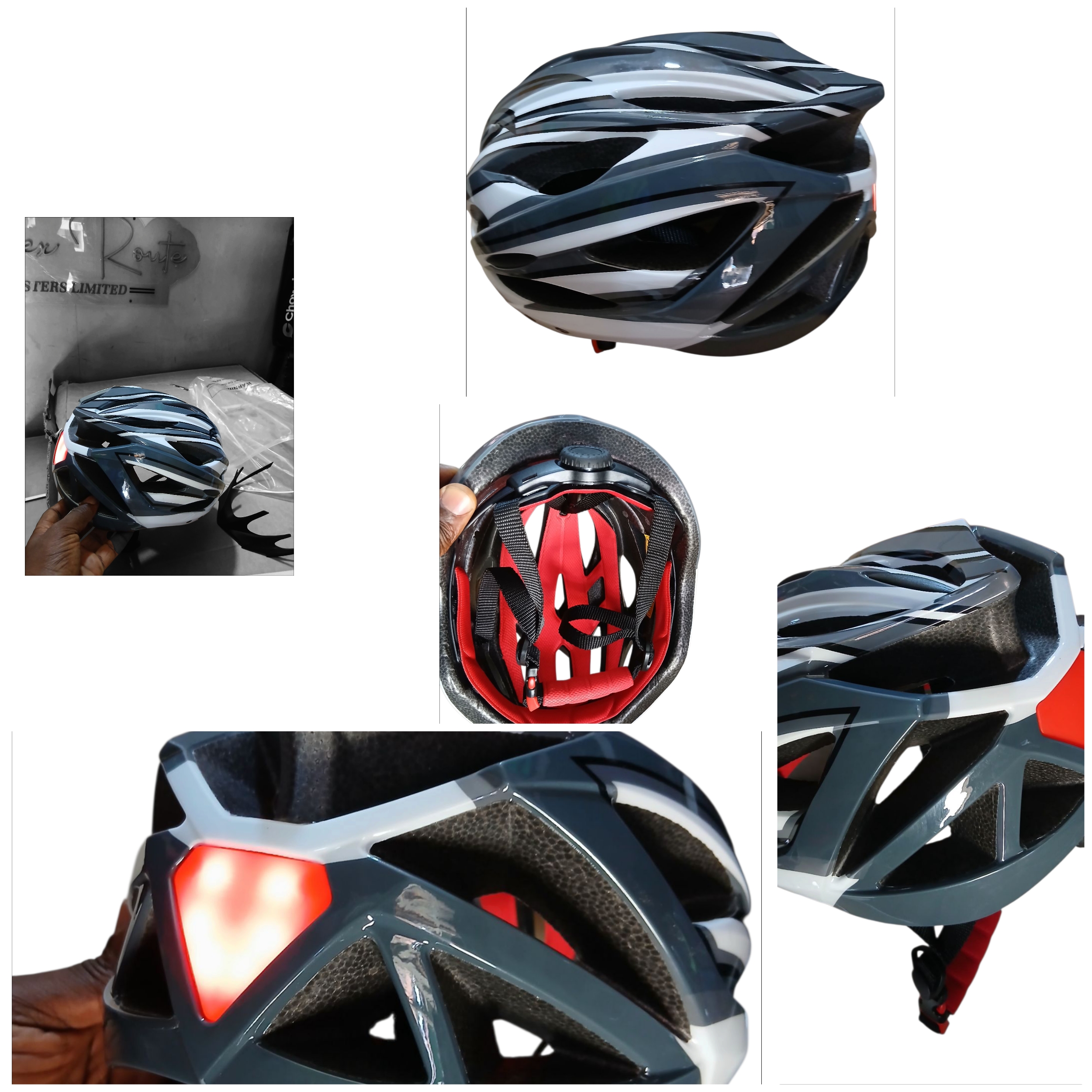 Top notch quality cycling/bicycle helmet built with back safefty light sign indicators, very strong and durable. Come with adjustable nozzle and head straps and sockets.